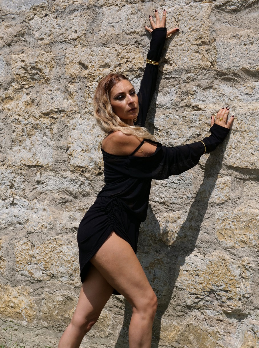 Les lignes brodées d’or et les strass dorés nous rappelle l’armure subtile et élégante de cette archétype, tandis qu’un bijou doré triangulaire, pointe vers le bas, vient symboliser la puissance ancrée et la force intérieure.